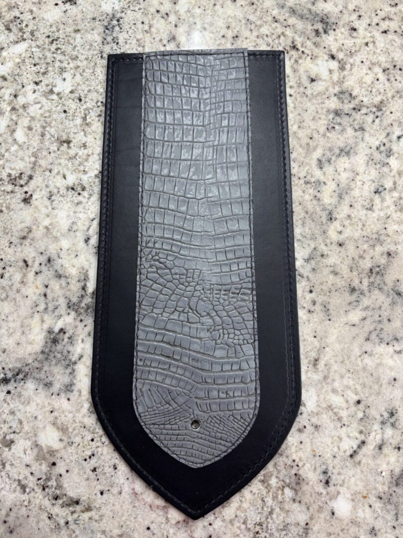 We make this Fender Bib with black chap leather overlay out of one ply of beautiful buffed Bridle Leather, and suede leather on the bottom side, stitched together, so nothing can scratch your bike. Then we stitch the chap leather overlay on top. This Fender Bib with billiards gray alligator embossed leather overlay is available with stainless steel or colored studs. We also make matching heat shields, tank bibs, crash bar covers and mud flaps.